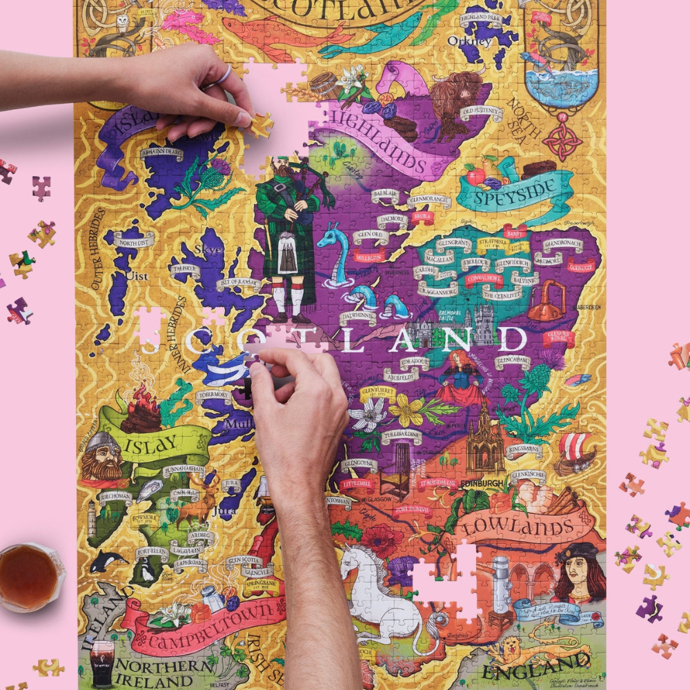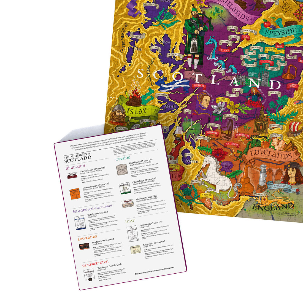 Ha van valami a kilten és skót dudán kívül, amiről Skócia híres, akkor az a whisky. Régre nyúló tradíciók övezik ennek az italnak a készítését valamint fogyasztását. A "Gasztrovilág puzzle - skót whisky" kirakós betekintést enged a skót whisky már-már mítikus világába, miközben egy részletgazdag, edukatív, és szemet gyönyörködtető térképpel is gazdagodhatsz.