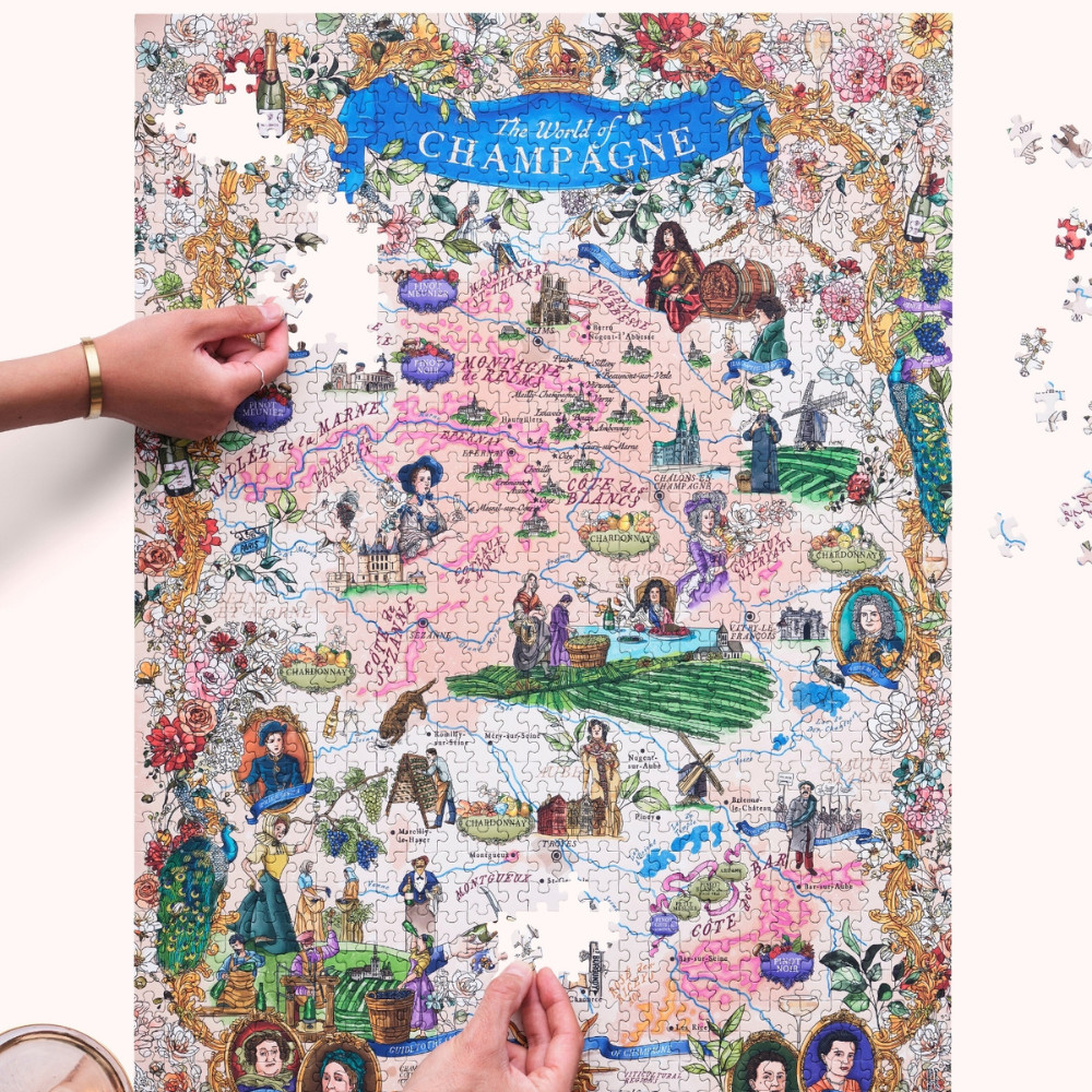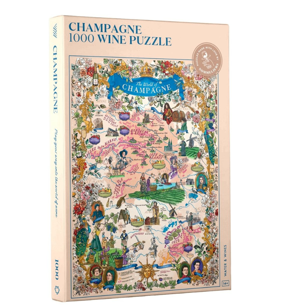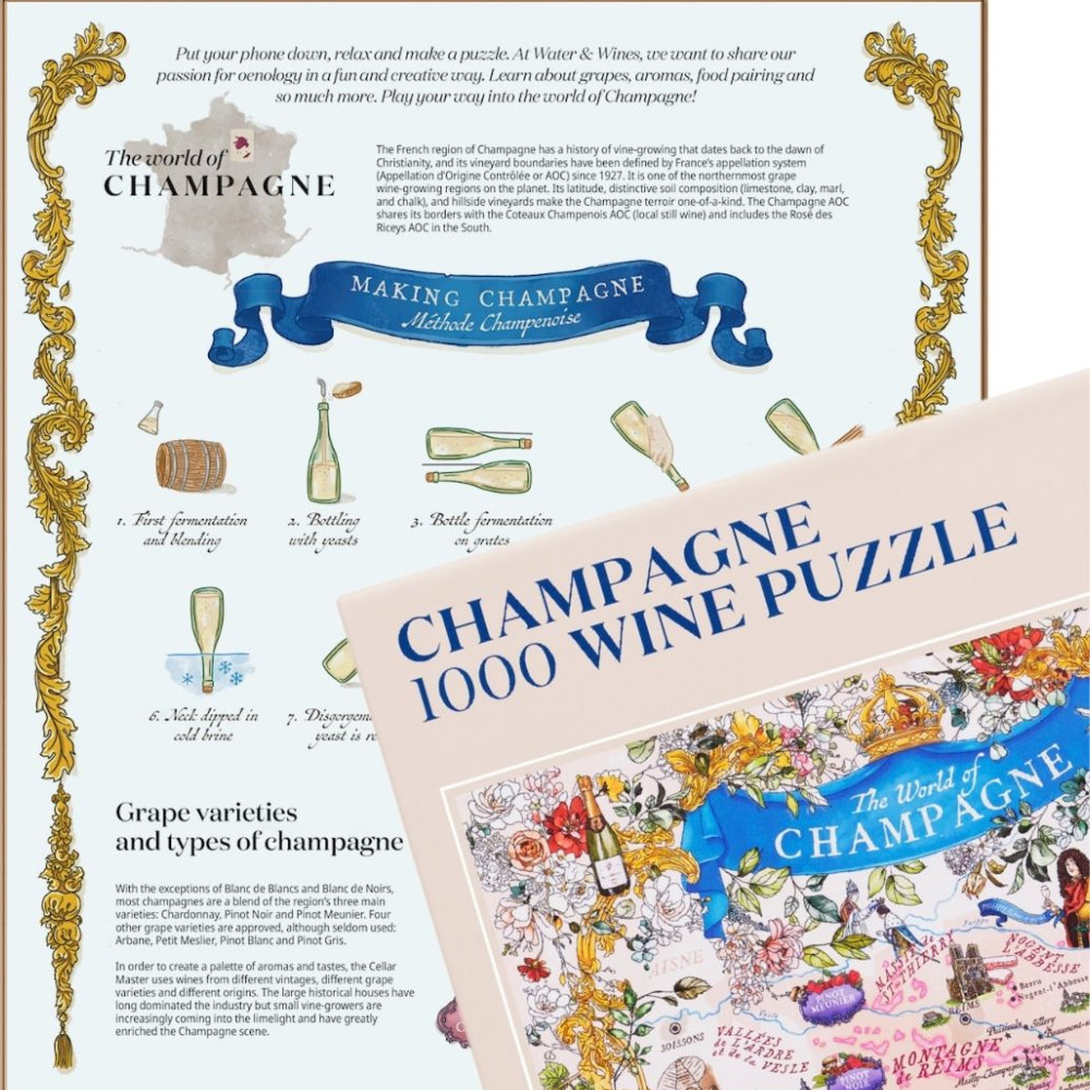 Lépj be a pezsgők fényűző világába ezzel a különleges Champagne kirakóssal! A gyönyörű, kézzel illusztrált kép nemcsak Franciaország ikonikus Champagne régióját mutatja be, hanem elrepít a táj gazdag történelmébe és kultúrájába is. A kirakós szakértői irányításával készült – Essi Avellan, Master of Wine és pezsgőspecialista közreműködésével. A kép feltérképezi Champagne főbb régióit, mind a 17 Grand Cru falut, valamint a szőlőfajtákat, amelyekből a világ egyik legünnepeltebb bora születik: a Chardonnay, a Pinot Noir és a Pinot Meunier. És hogy az élmény még autentikusabb legyen kirakózás közben hallgasd a Water&Wines csapatának ehhez a Kalandhoz összeállított zenei válogatását (a letöltéshez kattints ide)!